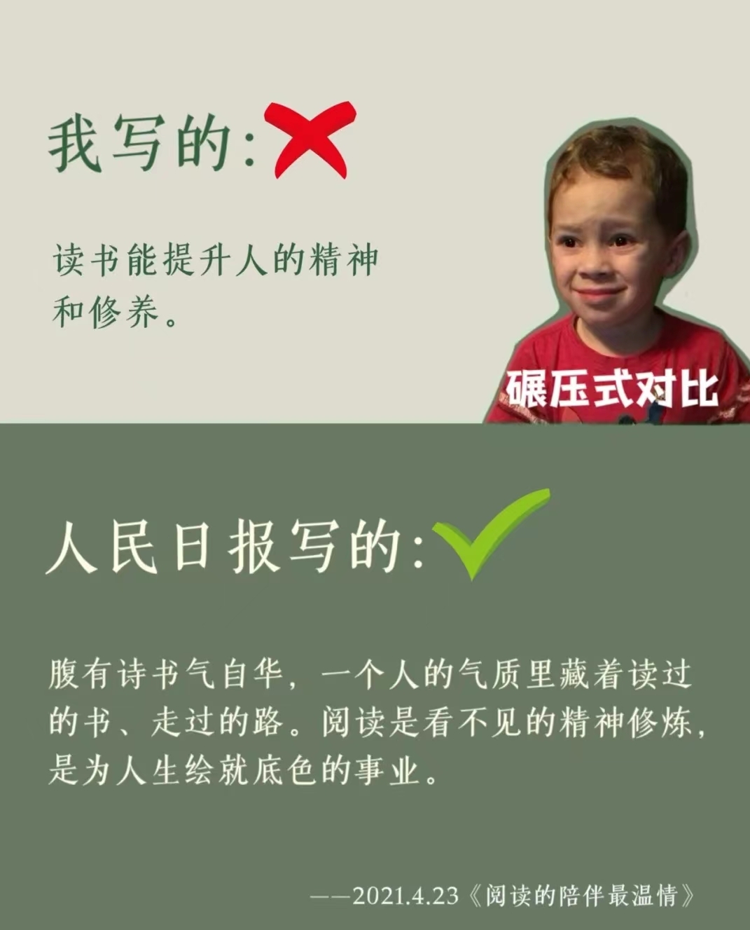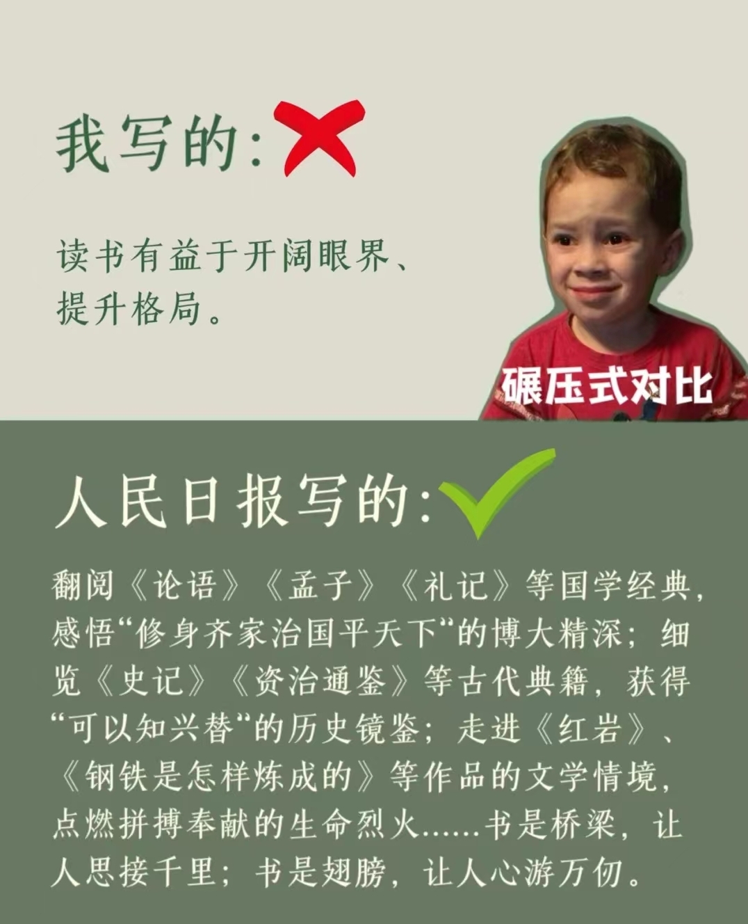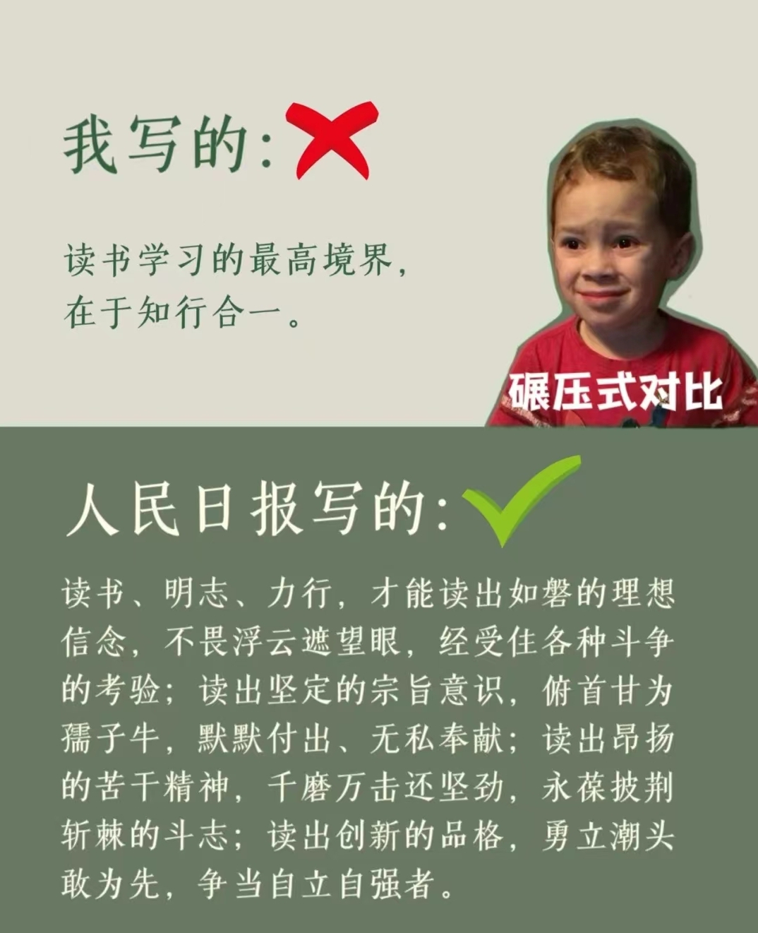 普通人写的读书学习和人民日报写的差别。<br><br>
