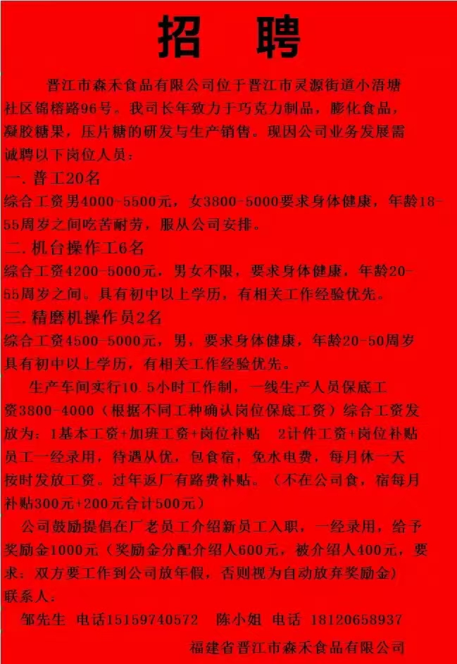 晋江森禾食品公司招聘<br><br>