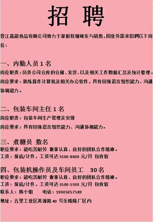 晋江嘉能食品公司招聘<br><br>