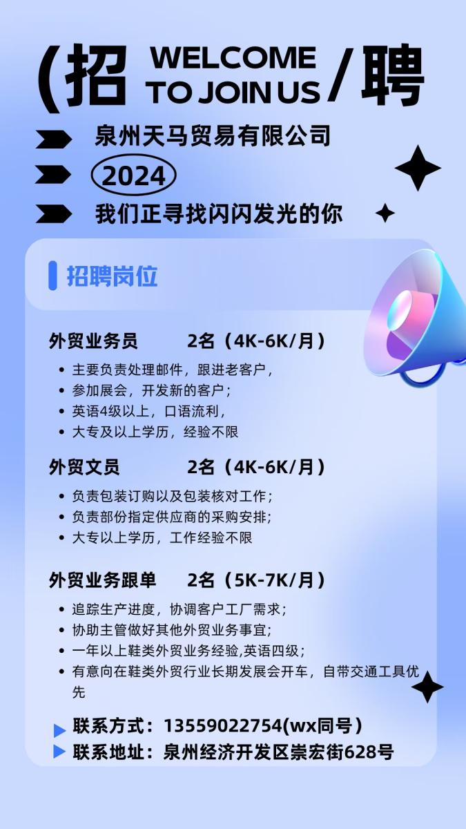 泉州天马贸易公司:招外贸业务员、外贸文员,有无经验均可。 上班时间:早8 ...
