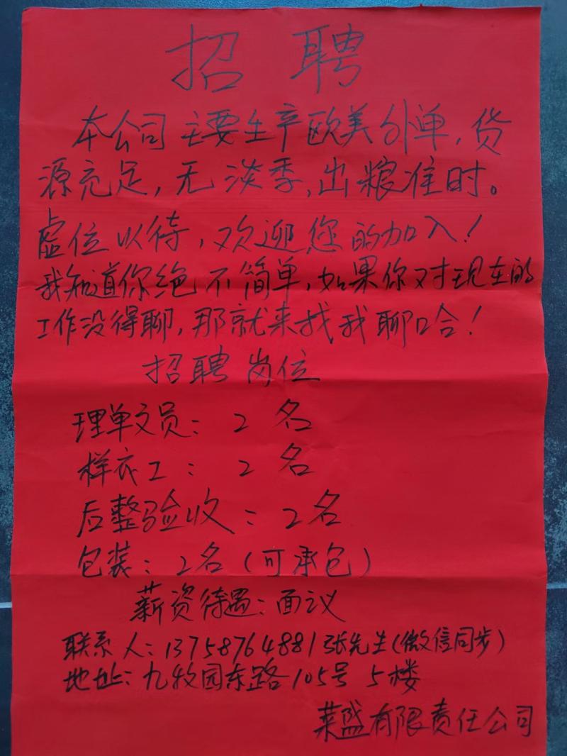 莱盛服饰有限责任公司招聘长期工 【岗位】理单文员2名、样衣工2名、后整验 ...