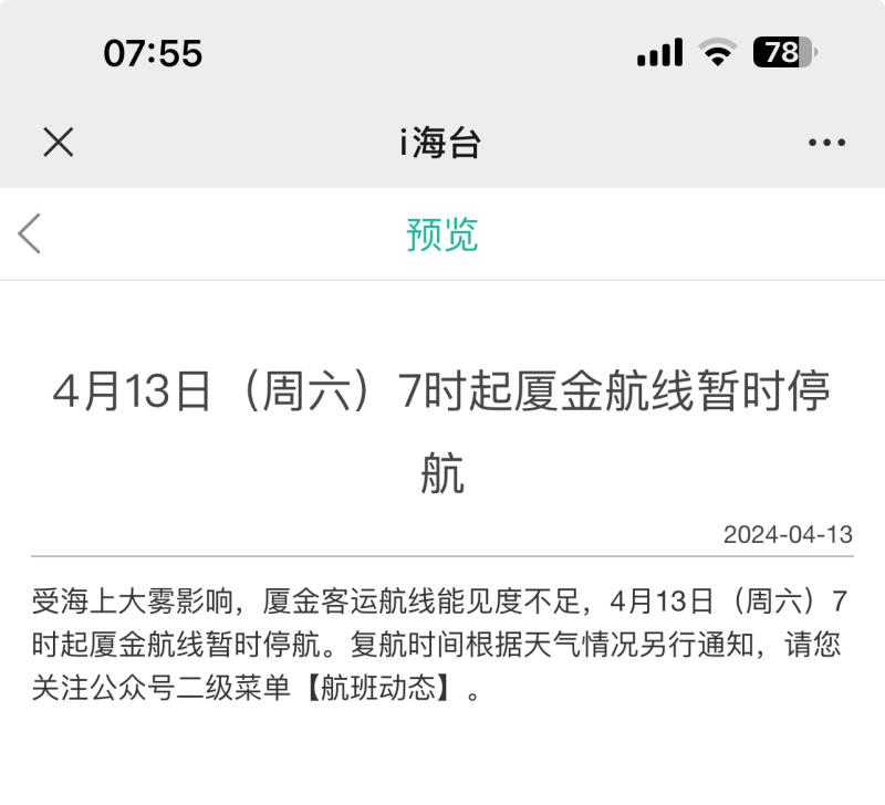 受海上大雾影响,厦金客运航线能见度不足,4月13日(周六)7时起厦金航线暂时停航。复航时间根据天气情况另行通知。2024-04-13<br>标题 : 4月13日(周六)7时起厦金航线暂时停航<br><br>