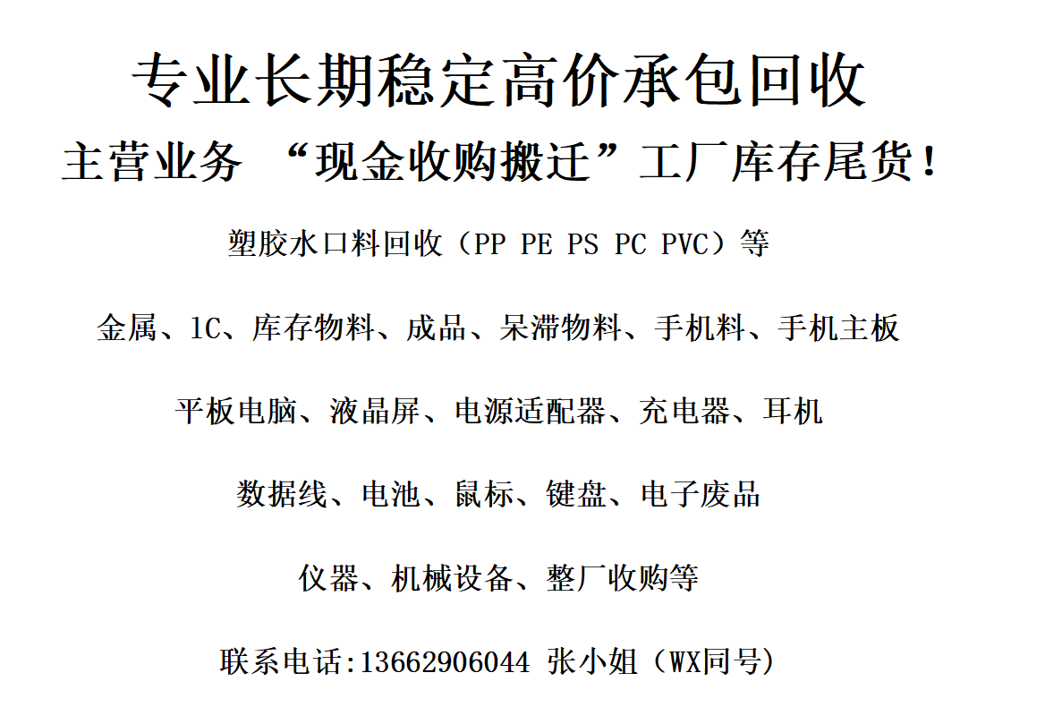 高价回收各类塑料、五金、电子件、整厂收购搬迁,如有需要我们将竭诚为您服务,期待您的光临!<br>标题 : 回收各类塑料:水口料、PP、PC等<br><br>